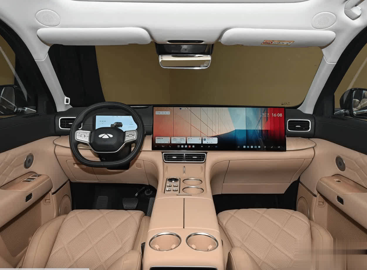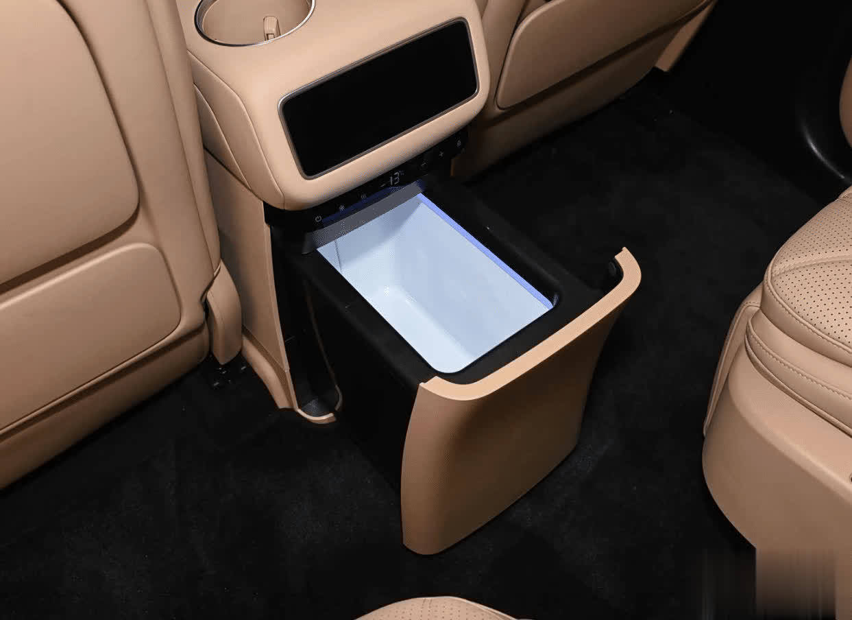走进车内,内饰的设计上,这款车的搭配还是比较惊艳的,这款车选用了一个30英寸6K分辨率的贯穿式显示屏,这个显示屏的尺寸看上去相当大气。不仅如此,它还有一个全液晶的仪表,感觉档次一下子就上去了。不仅如此,这款车还有HUD抬头显示、带风冷的双50W无线充电、水晶按钮、23个伯牙之音的扬声器等等。而在后排,它还有17.3英寸车顶显示屏,9.2L冷暖冰箱,并且这个冰箱可以支持-18℃—50度之间工作,而且即便你下车了,这个冰箱依旧会持续工作,可以说非常不错。